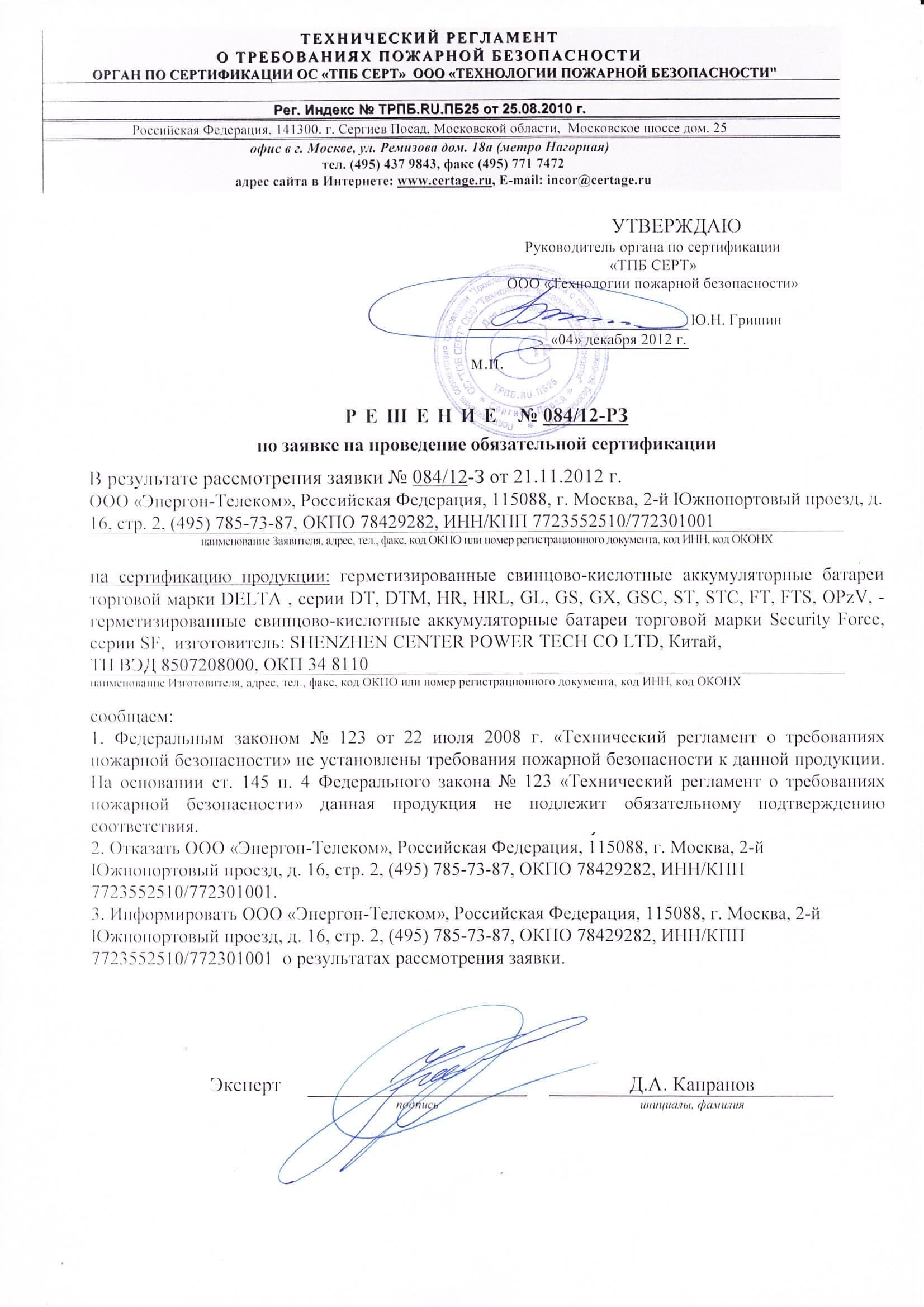 Герметизированный VRLA cвинцово-кислотный аккумулятор Delta DTM 1217 напряжением 12В и емкостью 17Ач изготовлен по технологии AGM (с микропористым заполнителем, пропитанным электролитом). Корпус изготовлен из негорючего ABS пластика. Срок службы аккумулятора достигает 6 лет. Аккумулятор предназначен для работы в режиме постоянного подзаряда (буферный режим) или в режиме разряд-заряд (циклический режим). Обладает низким внутренним сопротивлением и саморазрядом.