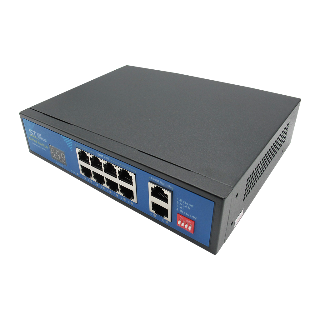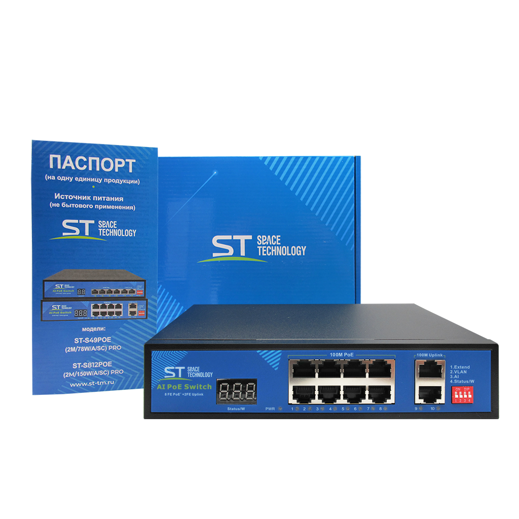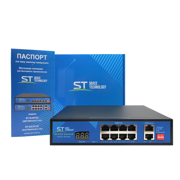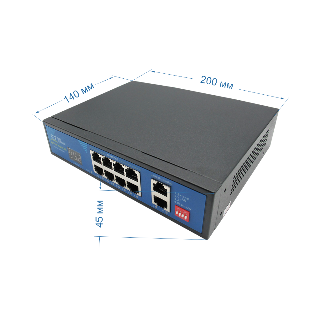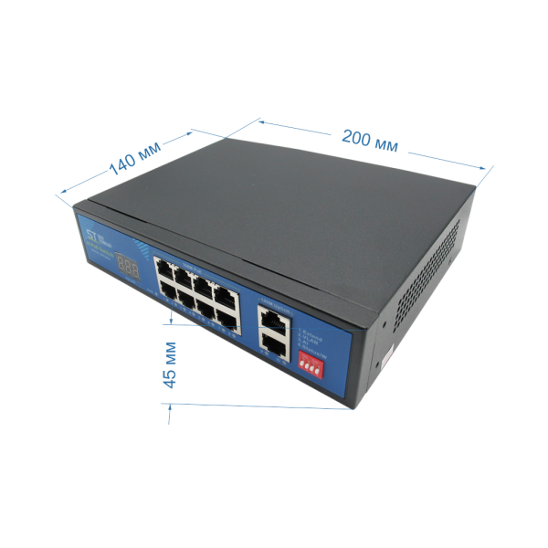 ST-S812POE (2M/150W/А/SC) PRO, Switch POE 8-ми портовый для обеспечения проводных сетей напряжением 48В , Защита от КЗ, Extend 250м., AI PoE, AI VLAN, Грозозащита, PoE порты: 8 х (10/100 Мбит/с), UpLink порты: 2 х (10/100 Мбит/с), SFP порты: Нет, Max.пропускная сп-ть: 100 Мбит/канал, Uвых: 48 (±10%), Р(ном) каждый порт (Вт): 19 Вт, Р(макс) каждый порт (Вт): 30 Вт, Р(сумм) общая (Вт): 150 Вт, Тип РоЕ: А, Коммутационная способность (Гбит/с): 2 Гбит/с, AI PoE(watchdog)/Vlan/Extend/Индикатор нагрузки, Система охлаждения: Пассивная, Активное РОЕ Металл, Температура эксплуатации: От -45°C до +55°C, Габариты изделия, мм.: 200х140×45