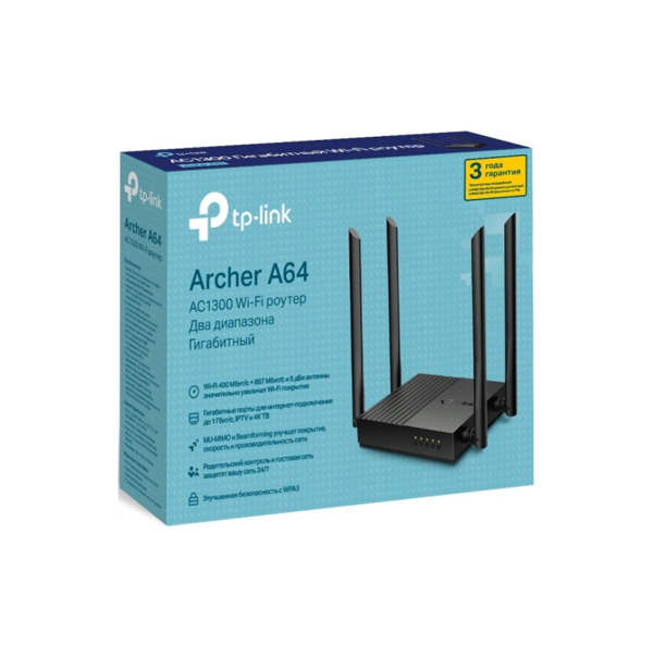 Благодаря четырём высокопроизводительным внешним антеннам роутера Archer A64 сигнал Wi‑Fi будет во всём доме, а технология Beamforming позволит улучшить качество сигнала для отдалённых устройств за счёт выявления их местоположения и концентрирования сигнала в их направлении.