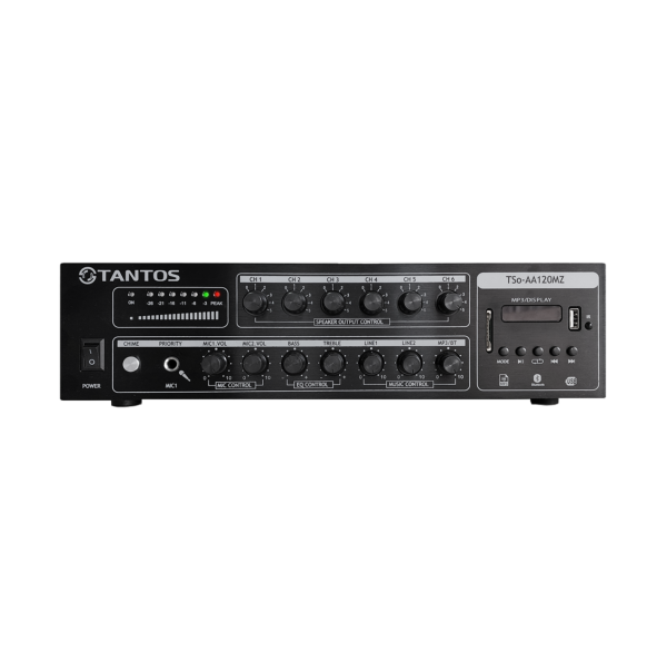 Усилитель Tantos TSo-AA120MZ 120 Вт, 6 зон, 100В, USB, SD карта, FM-тюнер, Bluetooth, mp3, 2 микрофонных / 2 линейный входа, 1 линейный выход, кнопка привлечения внимания «Chime»